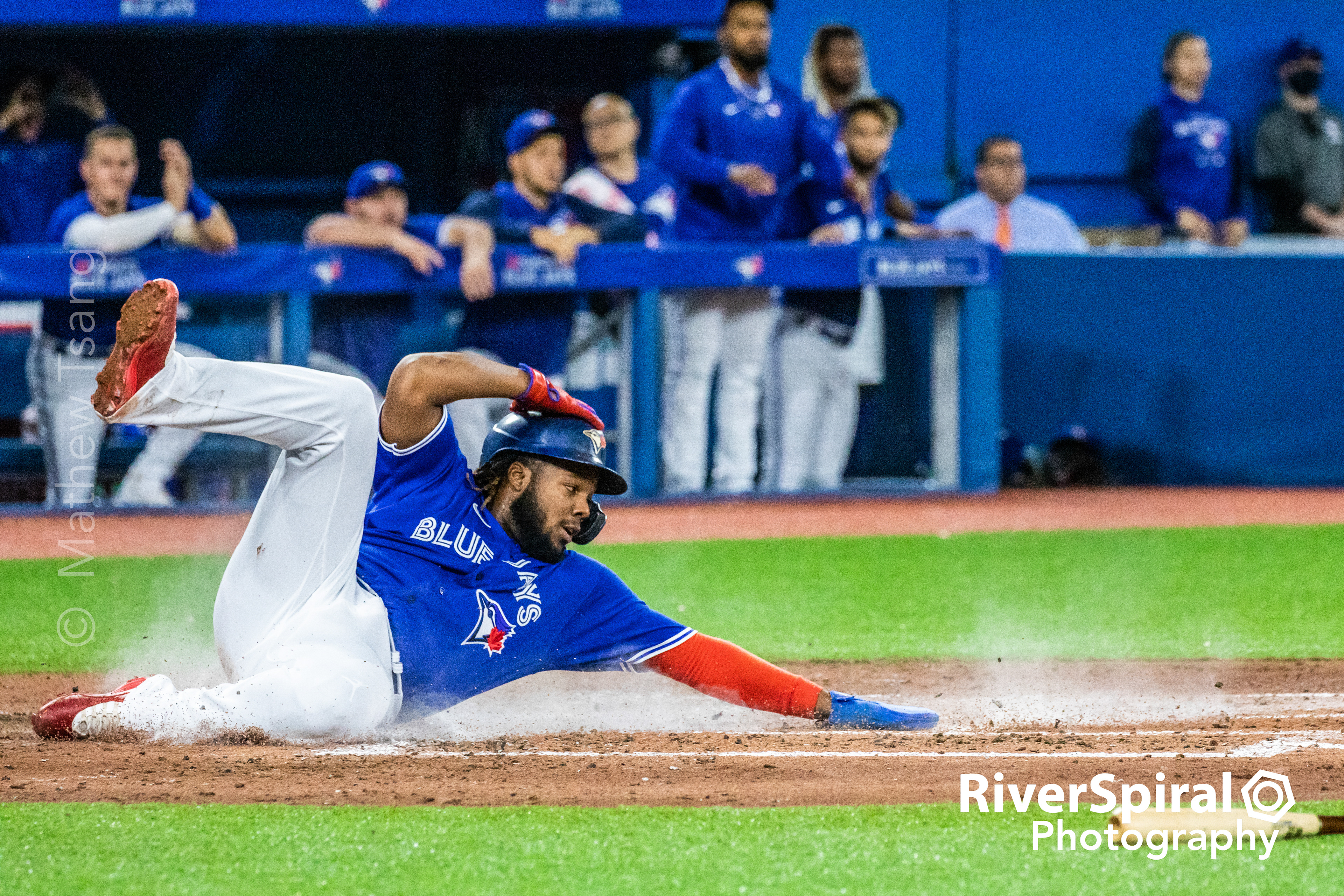 Vladimir Guerrero Jr. (27) slides into home.