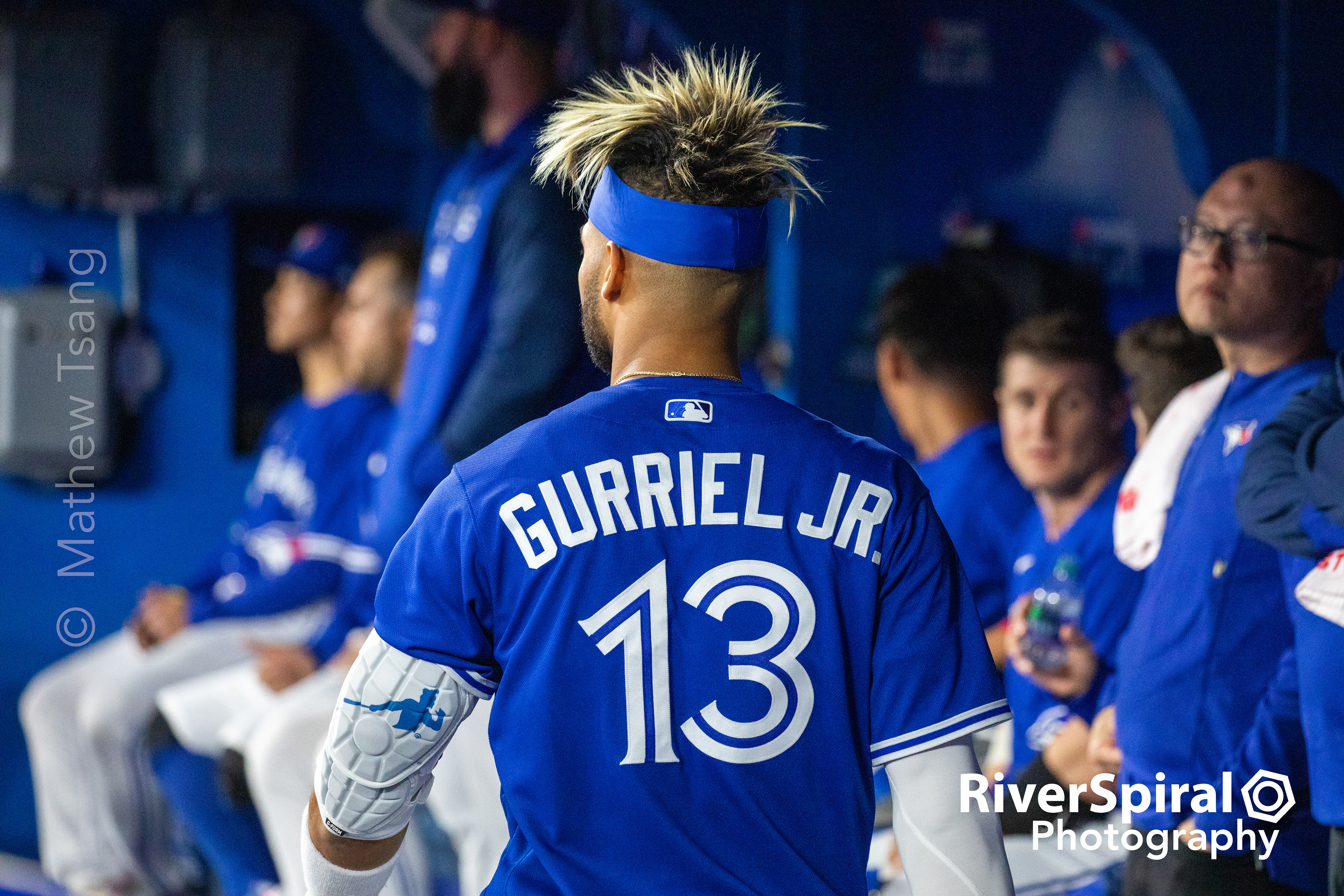 Lordes Gurriel Jr. (13) watches the action from the dugout.