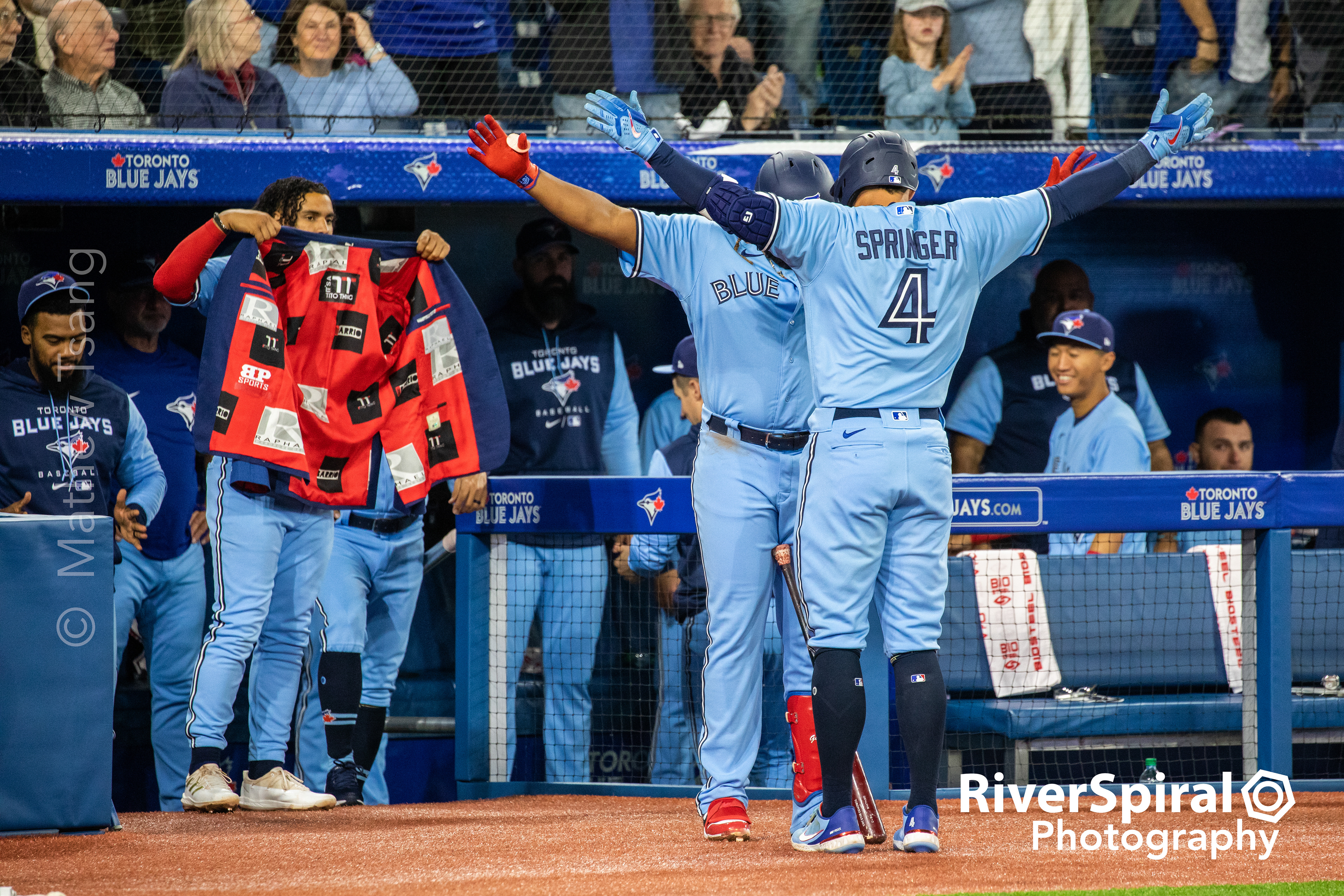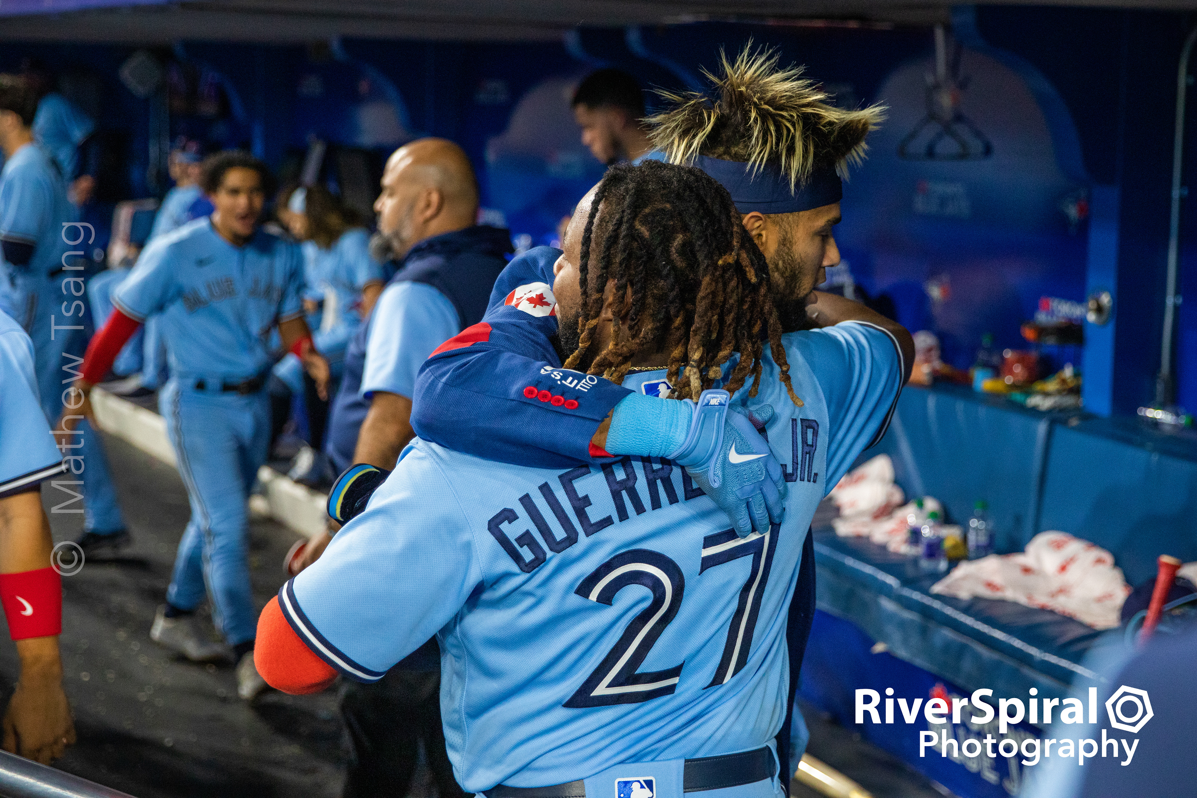Vladimir Guerrero Jr. (27) and Teoscar Hernandez (37) celebrate at the team bench.